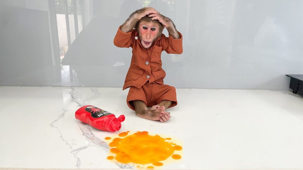 Cubis the monkey is worried about spilling the bottle of chili sauce!