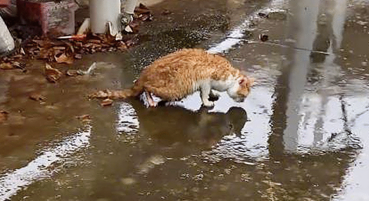 Under a dark and stormy sky, a tiny stray kitten crouched beneath an old, broken cart. Its fur was soaked and matted, its little body trembling from cold and hunger. The streets were empty except for puddles of muddy rainwater that gathered along the roadside. The kitten, desperate for something—anything—to fill its empty belly, bent down and began lapping at the dirty water. It didn’t care about the taste or smell; survival was all it knew.